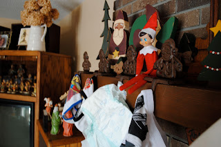 Sitting innocently on the mantel after removing the stockings and replacing them with the boys' underwear and diapers...